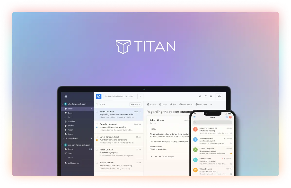 Build trust with a professional inbox on your own domain. Titan Email gives you modern webmail and mobile apps, strong security, and productivity features like Send Later, Read Receipts, and Follow-up Reminders—everything you need to communicate like a business.